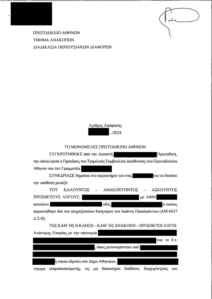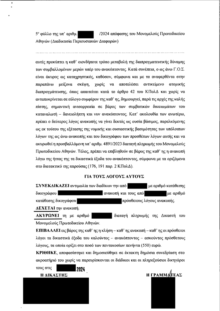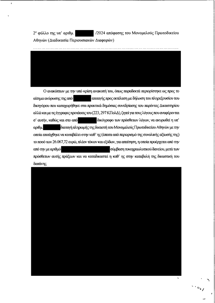 Με την υπ’ αριθμ. 24../2024 απόφαση του Μονομελούς Πρωτοδικείου Αθηνών, έγινε πλήρως δεκτή η ανακοπή του δανειολήπτη κατά της έκθεσης αναγκαστικής κατάσχεσης. Η επίμαχη απαίτηση προερχόταν από στεγαστικό δάνειο που είχε χορηγηθεί από την πρώην Λαϊκή Τράπεζα Κύπρου (CPB) μέσω του ελληνικού υποκαταστήματός της.